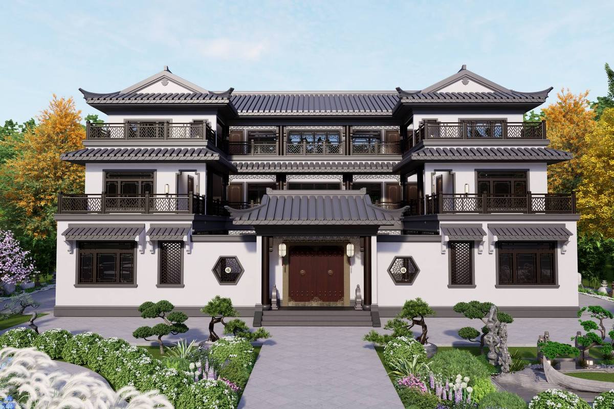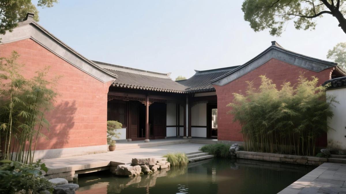 低饱和度的哑光砖红色墙面,搭配浅灰色屋檐线条,是南方四合院常见的配色方案。砖红色源自传统青砖烧制后的自然色泽,自带岁月沉淀感;浅灰色则弱化了暖色的浮躁,呈现出沉稳大气的视觉效果。这种配色在江南水乡尤为常见,与庭院中的翠竹、流水相得益彰,展现出中式建筑的雅致美学。