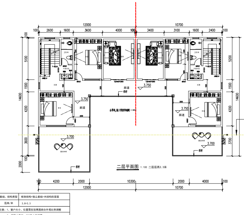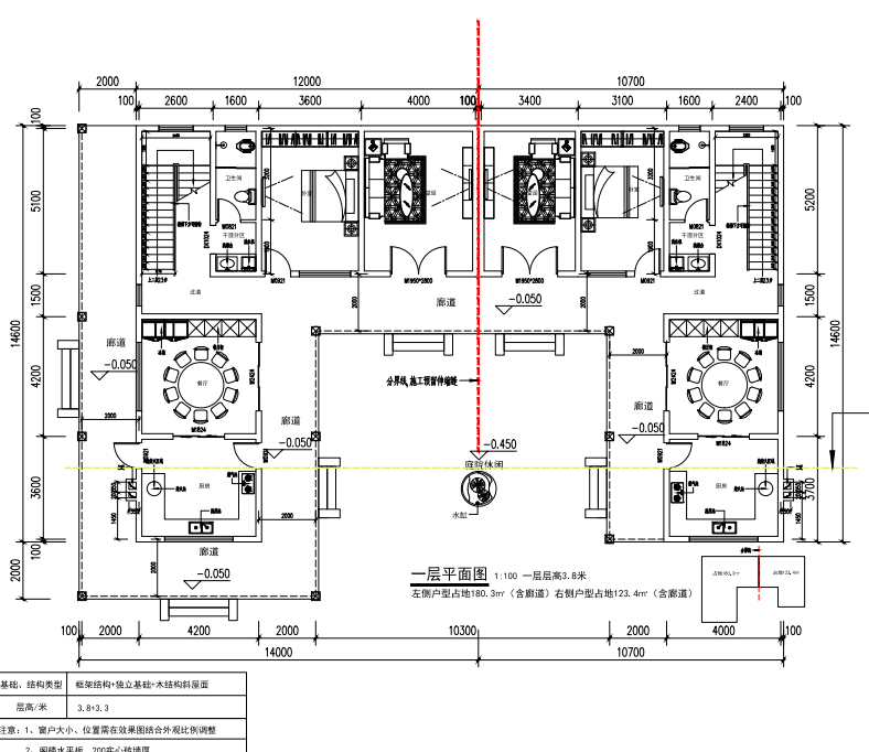 结合实地勘测和业主需求设计方案,该别墅外观暂定为两层中式三合院,采用框架结构+独立基础+木结构斜屋面设计,一层层高3.8米,二层层高3.3米,主体干墙体厚度达200mm,兼具结构安全性与居住舒适性。两户报建面积分别为120㎡与90㎡,每户均配置独立厨房、餐厅、卧室及干湿分离卫生间,中间共享中式庭院区域,功能分区清晰,居住动线流畅,真正实现了“独门独户不疏离,合院聚居有温度”的设计理念。
