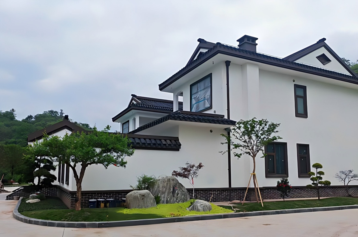 建筑采用白墙黛瓦的经典中式形制,飞檐翘角、花格窗棂尽显东方韵味,框架结构则保障了空间的通透灵活与结构安全,适配家庭长期居住需求。庭院内造景层次丰富,绿植、景石、步道相映成趣,既保留了四合院的围合归属感,又融入现代生活的开阔感。