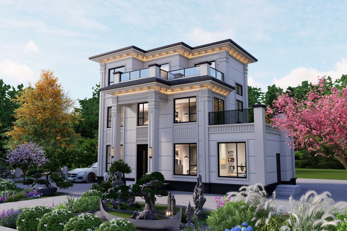 本次签约的唐府别墅为新中式风格定制设计,建筑整体以浅米白真石漆为外立面基底,搭配深灰色中式青瓦坡屋顶,檐口处点缀传统条纹装饰线条,入户区域采用石材立柱凸显端庄质感,同时规划多处通透观景露台,实现东方建筑美学与现代居住需求的融合。项目结构采用砖混结构搭配条形基础,设置阁楼水平板与现浇斜屋面保障稳固性,设计层高为一层3.6米、二三层各3.3米(均含板厚),目前全套施工图已完成深化落地。